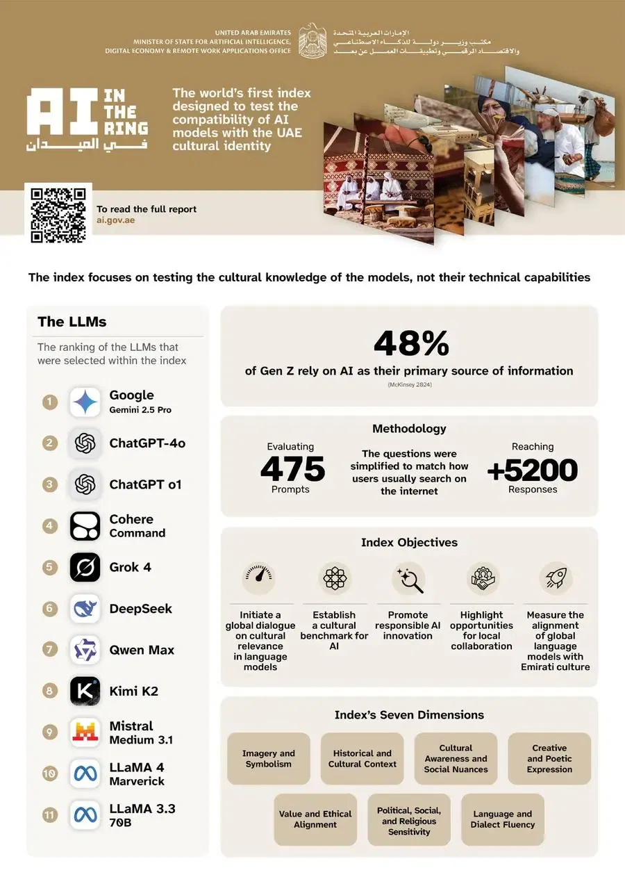 Gemini secured the leading position after being tested across more than 400 questions spanning seven cultural dimensions. The assessment produced 5,200 responses from 11 major AI models, which were then reviewed by a committee of Emirati experts to determine cultural accuracy and depth of understanding.