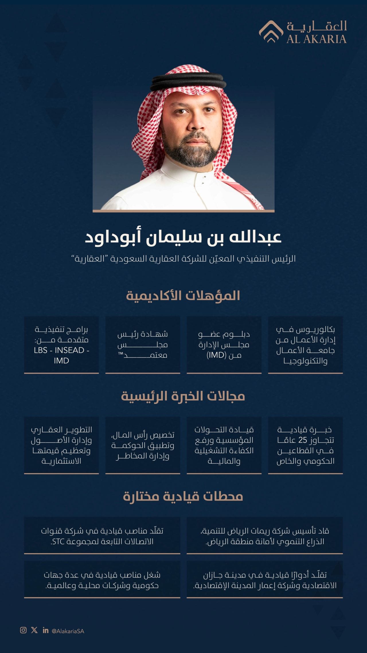 Saudi Arabia’s Saudi Real Estate Company (Al Akaria) has announced the appointment of Abdullah bin Sulaiman Abudawood as its new Chief Executive Officer, as the company looks to strengthen leadership and accelerate its strategic priorities.