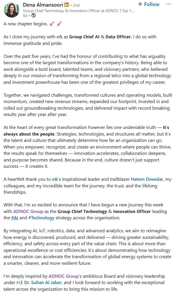 Sharing her new role on LinkedIn, AlMansoori wrote, “I’m so excited to announce that I have begun a new journey this week with ADNOC Group as the Group Chief Technology & Innovation Officer, leading the AI and Technology strategy across the organisation.”
