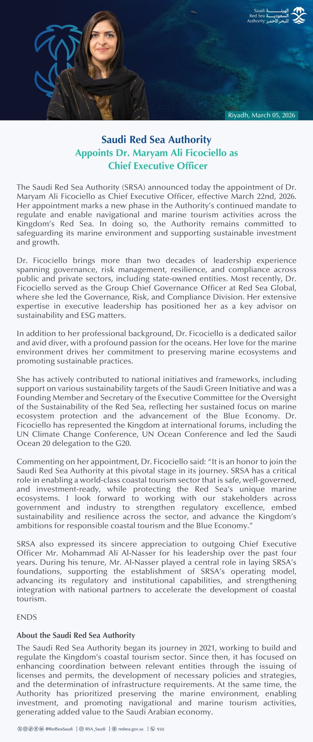 The Saudi Red Sea Authority (SRSA) has appointed Dr. Maryam Ali Ficociello as its new Chief Executive Officer, effective March 22, 2026, marking a leadership transition aimed at strengthening the Kingdom’s coastal tourism governance.