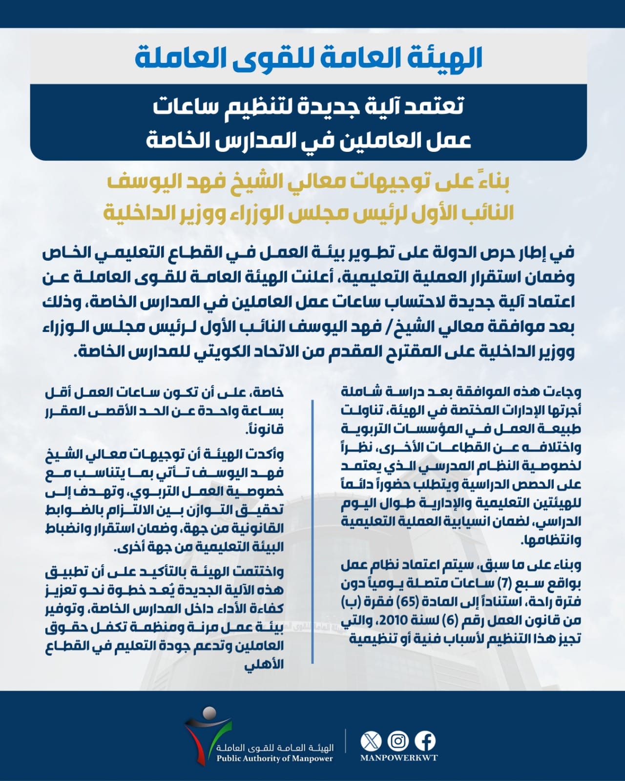 Kuwait’s Public Authority for Manpower (PAM) has approved a new mechanism that caps the working hours of private school employees at seven actual hours per day, in a commitment to streamlining working conditions across the private education sector,