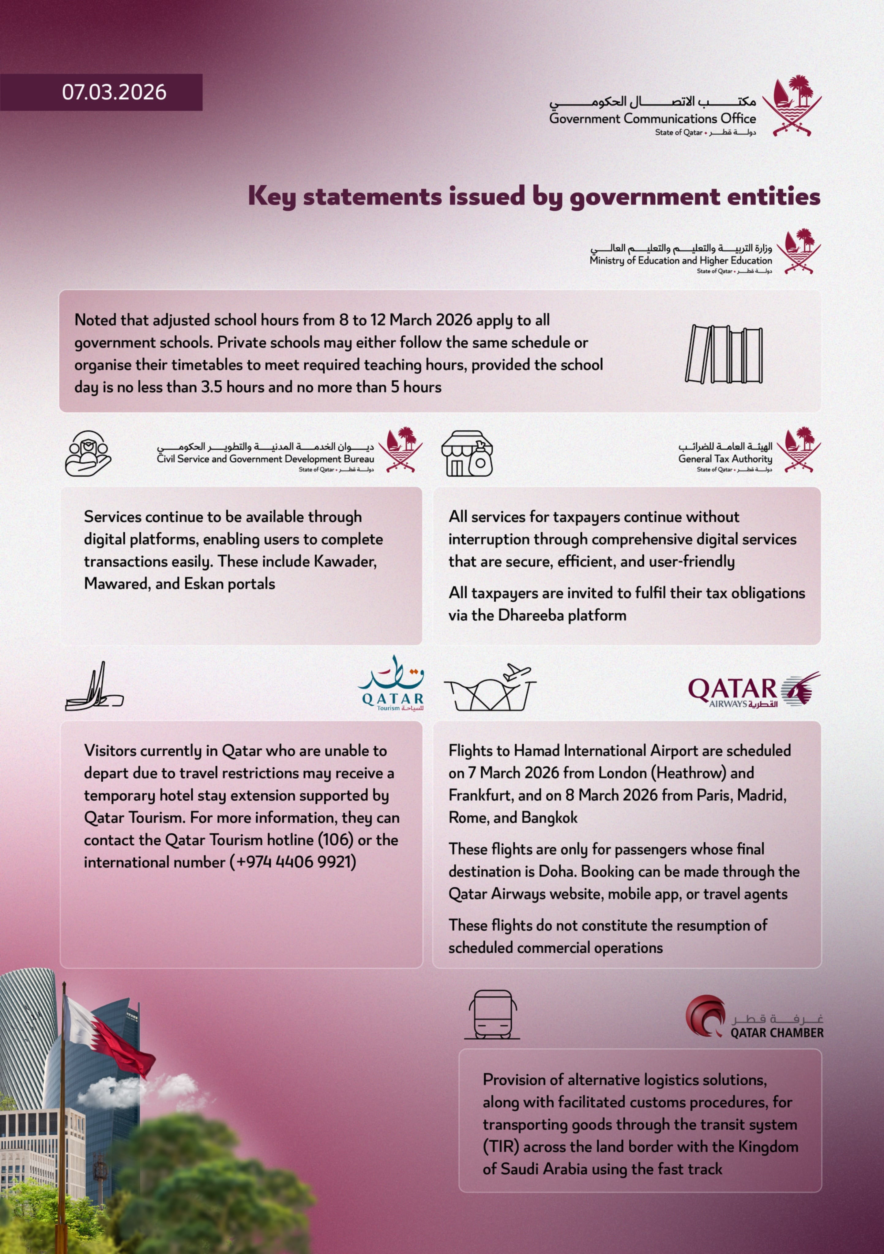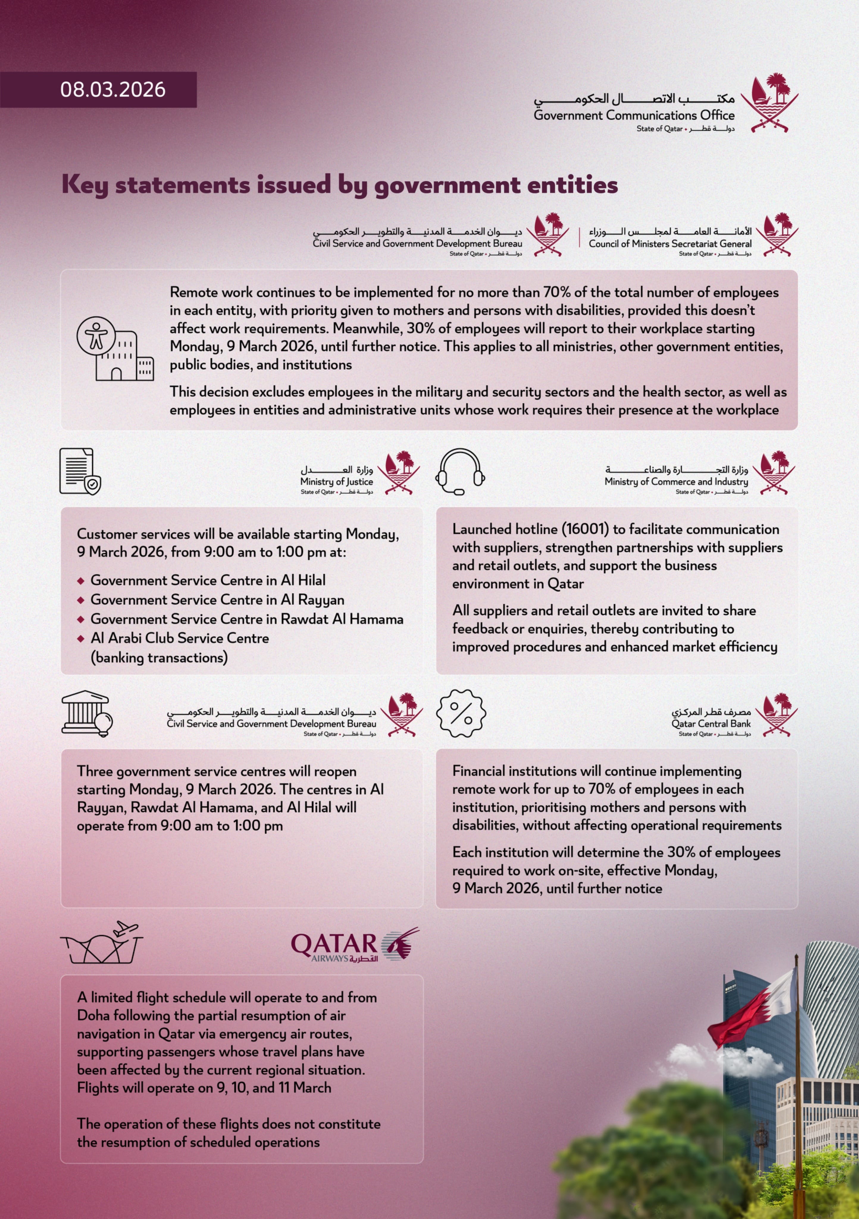 Government services are also gradually reopening with modified hours. The Ministry of Justice confirmed that select customer service centres—including facilities in Al Hilal, Al Rayyan, and Rawdat Al Hamama—will operate from 9:00 am to 1:00 pm starting 9 March.
