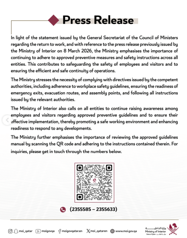 "In light of the statement issued by the General Secretariat of the Council of Ministers regarding the return to work, and with reference to the press release previously issued by the Ministry of Interior on 8 March 2026, the Ministry emphasises the importance of continuing to adhere to approved preventive measures and safety instructions across all entities."