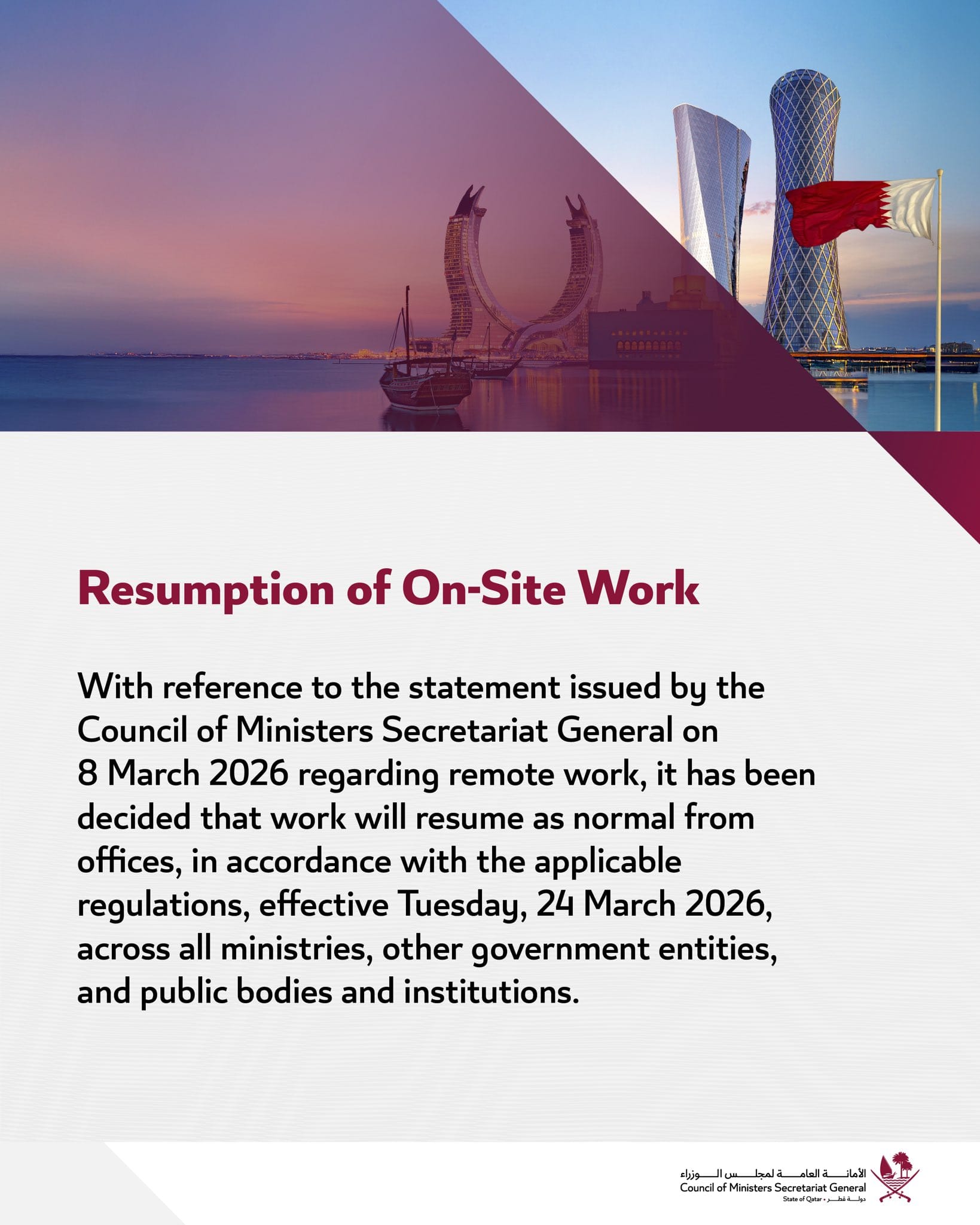 The Council of Ministers Secretariat General has announced that government employees in Qatar will resume work from offices starting Tuesday, March 24, 2026, with normal operations returning across ministries, government entities, and public institutions.
