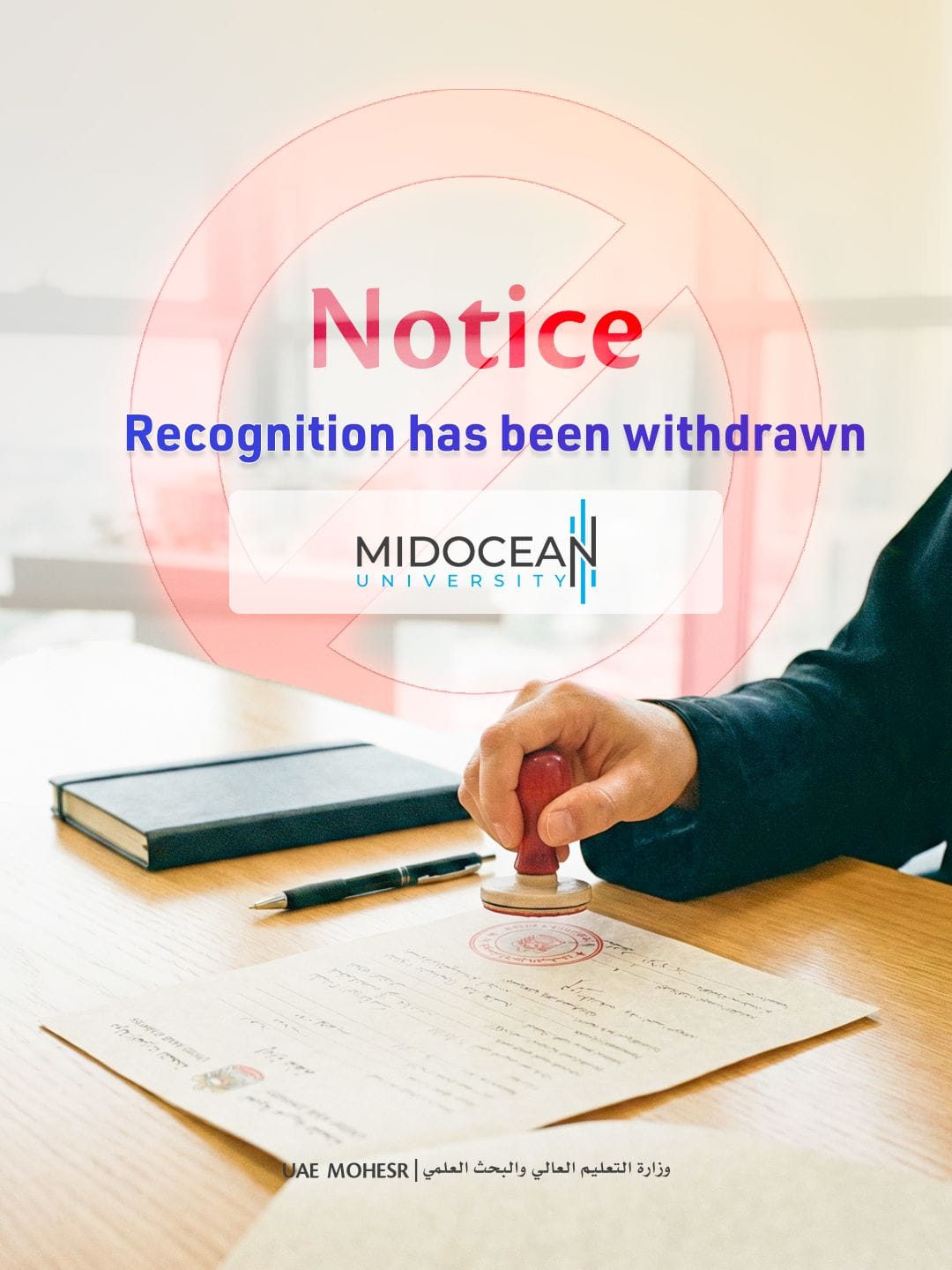 The Ministry of Higher Education and Scientific Research (MoHESR), UAE, has withdrawn recognition for all qualifications issued by Midocean University, following a joint inspection that uncovered serious compliance breaches at the institution’s executive office in Fujairah.