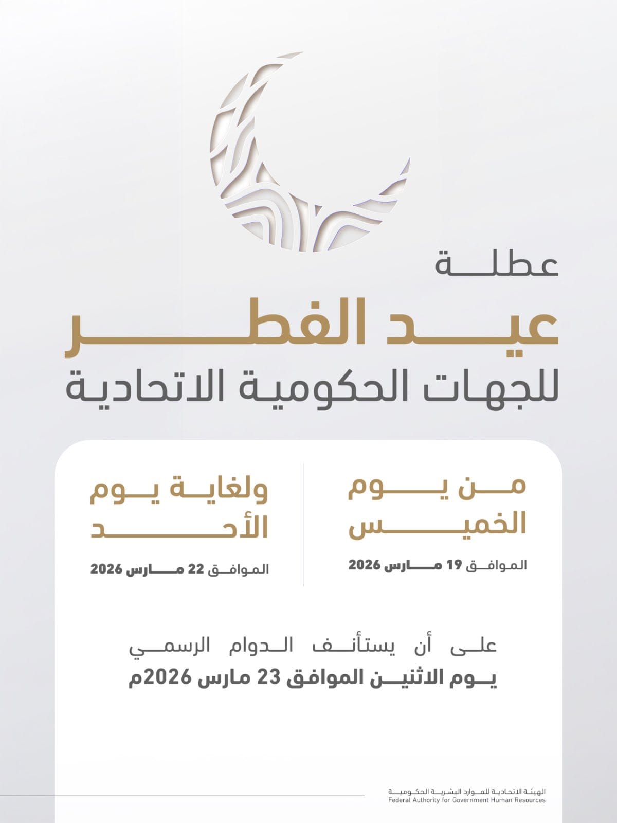 “Eid Al-Fitr holiday for the federal government from March 19 to 22, 2026,” FAHR said.