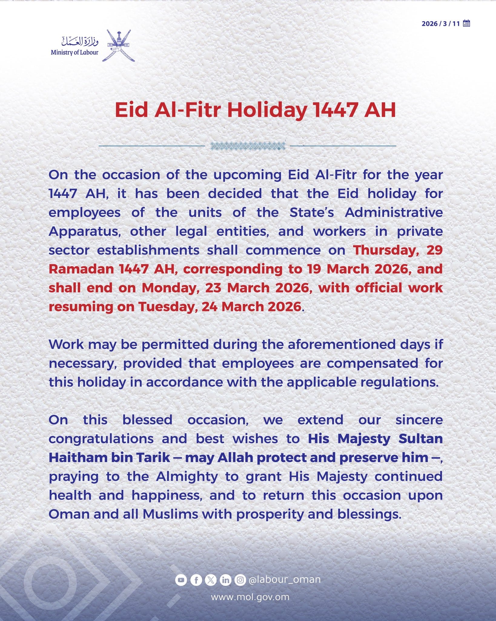 The Labour Ministry confirmed that the holiday will start from Thursday, March 19, 2026, covering employees of the State Administrative Apparatus, other legal entities, and workers in private sector establishments across the Sultanate.
