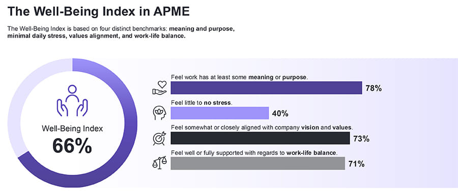 Heavy workloads and persistent pressure remain the primary drivers. While the overall well-being index ticked up slightly to 66%, younger workers appear more vulnerable.