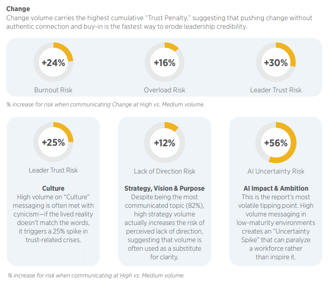 The report underlines that over-communicating can backfire, as employees inundated with messages are 30% more likely to lose trust in leadership and 24% more susceptible to burnout.