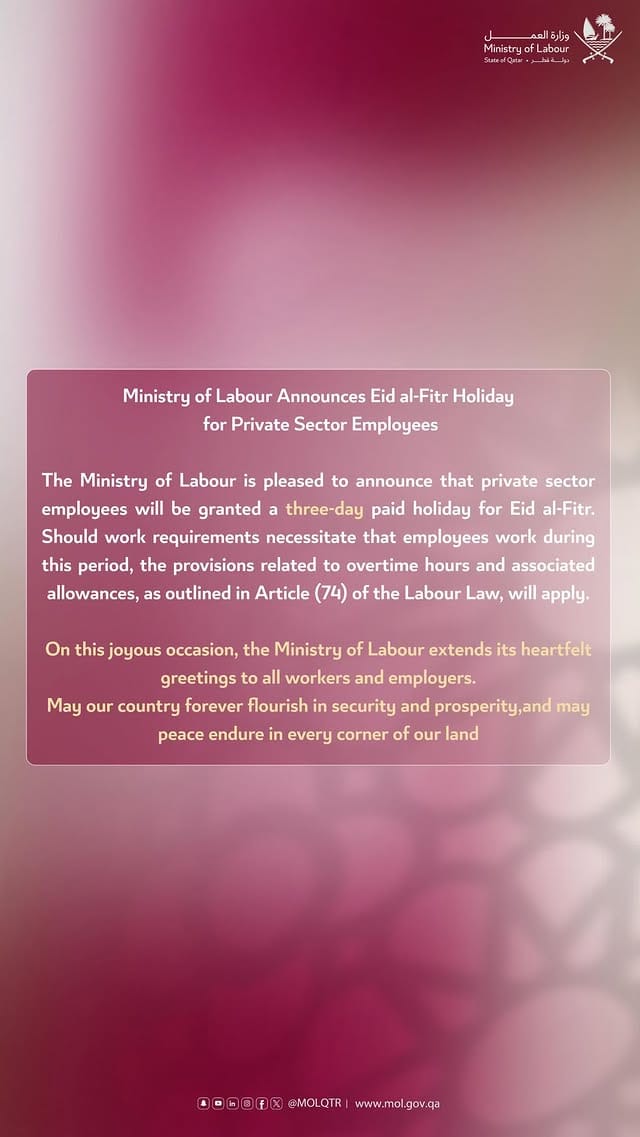 For the private sector, the Ministry of Labour has announced a three-day Eid al-Fitr holiday schedule. “The Ministry of Labour announces that employees of private sector establishments governed by the Labour Law shall be granted a three-day Eid Al-Fitr holiday with full pay.