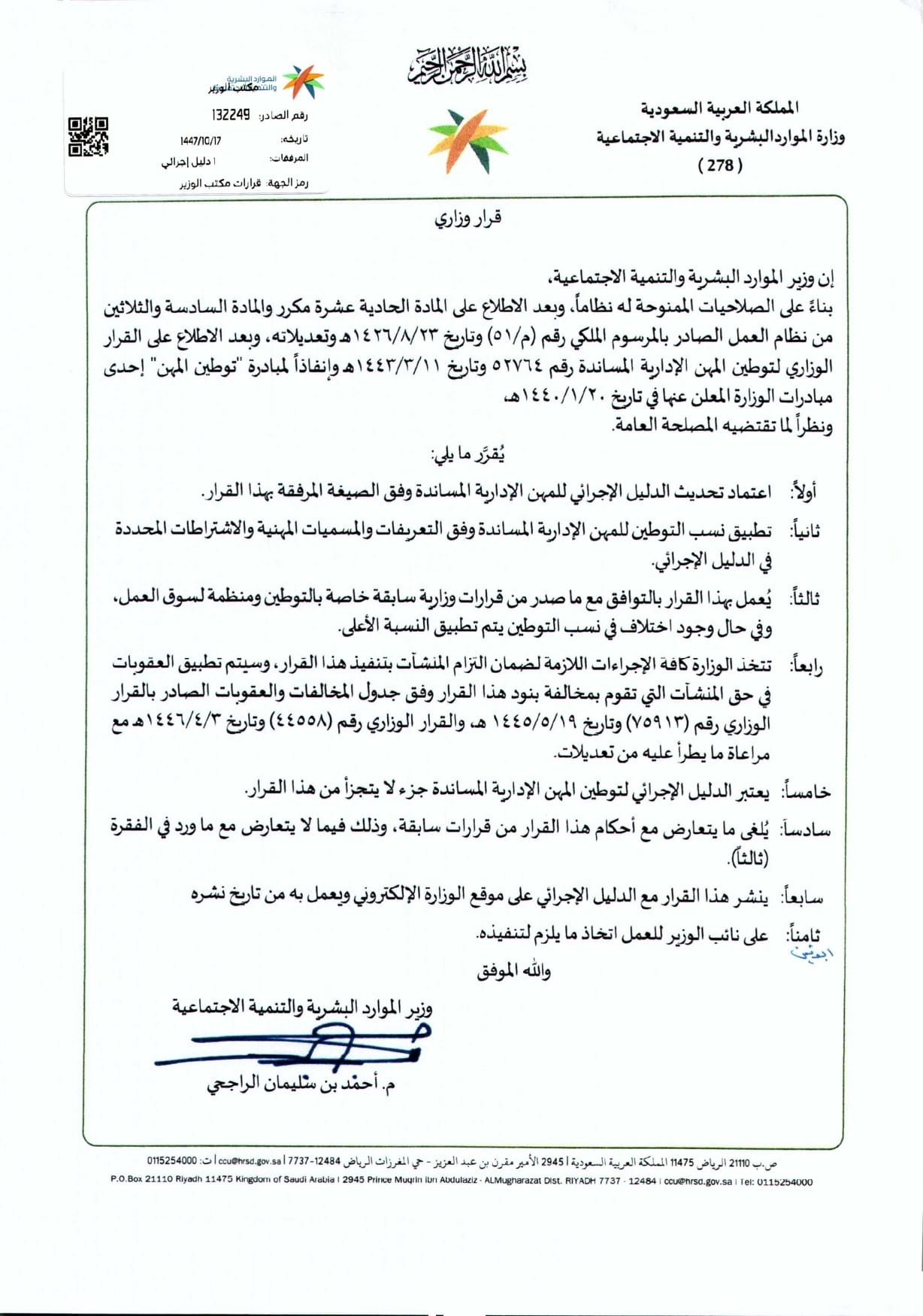 The Ministry said the decision was issued under Ministerial Resolution No. 132249 dated April 5, 2026, as part of ongoing initiatives to increase workforce nationalisation and expand employment opportunities for Saudi citizens in administrative professions.