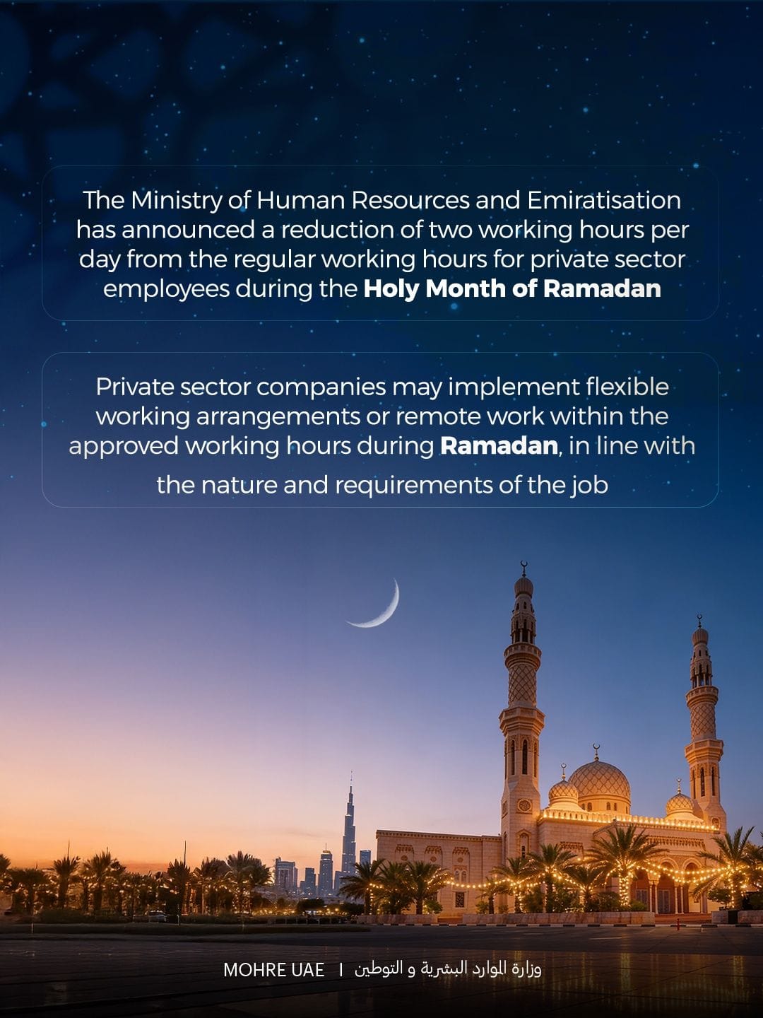 “The Ministry of Human Resources and Emiratisation has announced a reduction of two hours per day from the regular working hours for private sector employees during the Holy Month of Ramadan,” the Ministry said.