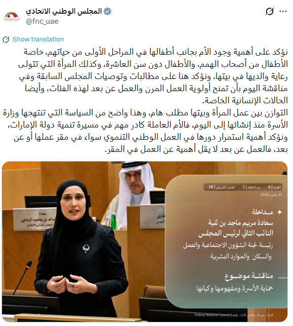 During a Federal National Council (FNC) session held on Wednesday, January 21, members called for flexible and remote work policies to be prioritised for mothers and other groups with caregiving responsibilities, particularly during the early years of a child’s life.