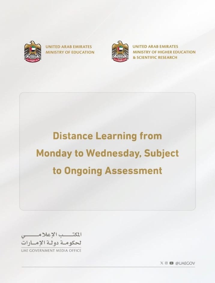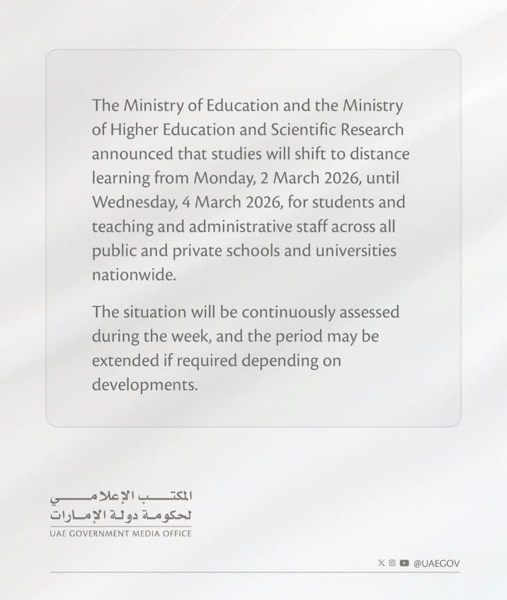 To safeguard students and staff, the Ministry of Education (UAE) and the Ministry of Higher Education and Scientific Research (UAE) have directed all educational institutions nationwide to shift to distance learning until March 4.