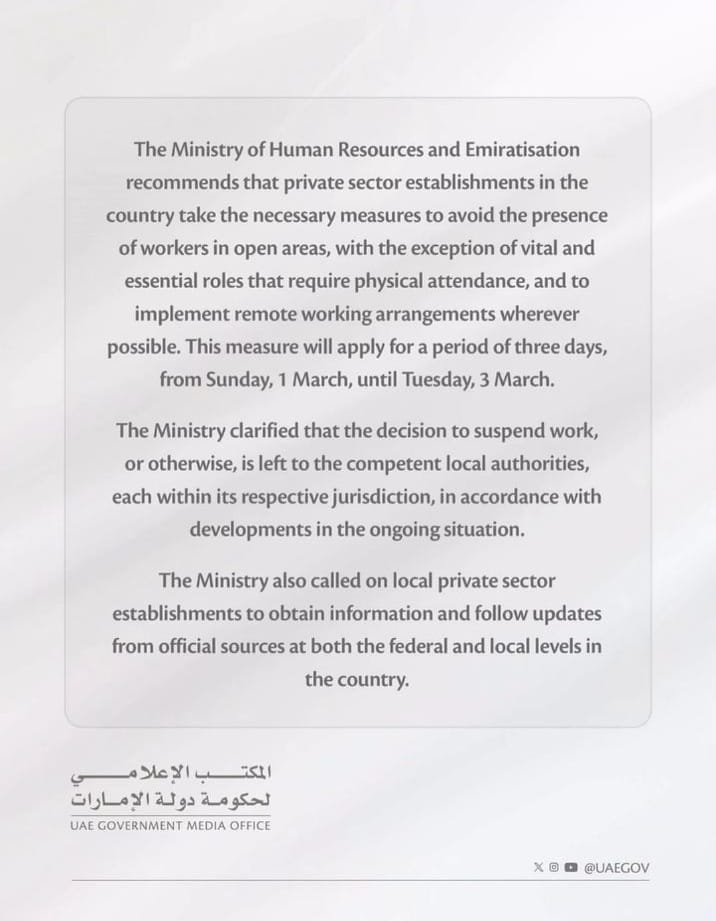 MOHRE further called on companies to closely follow official updates issued at both federal and local levels to ensure employee safety and regulatory compliance.