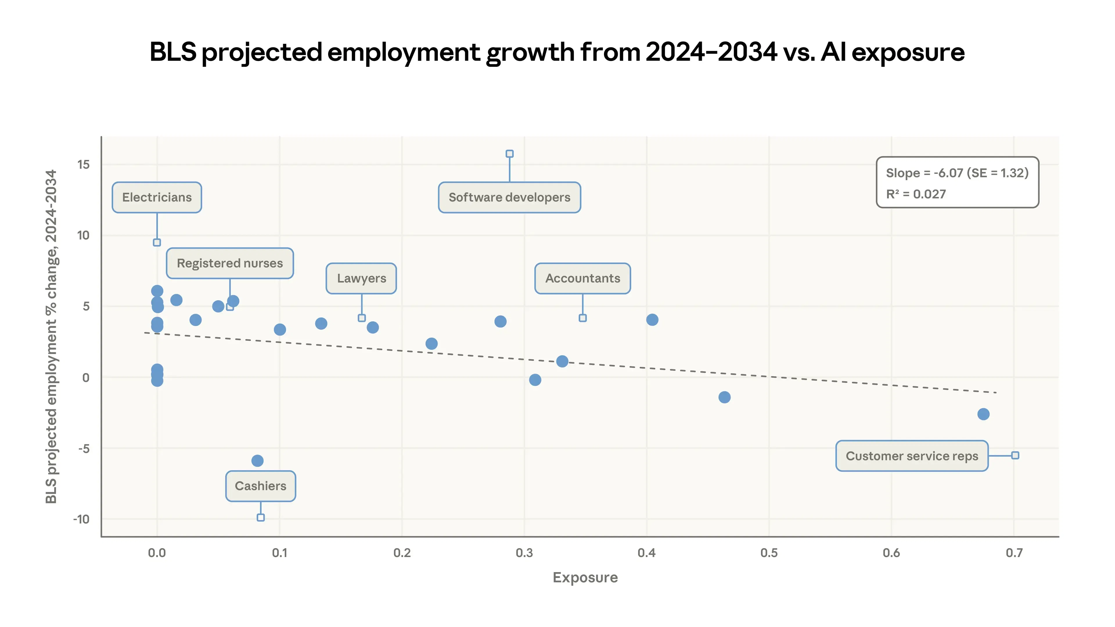 The study also compares AI exposure with employment projections published by the U.S. Bureau of Labor Statistics. It finds that occupations with higher exposure to AI tend to show slightly weaker projected employment growth through 2034.