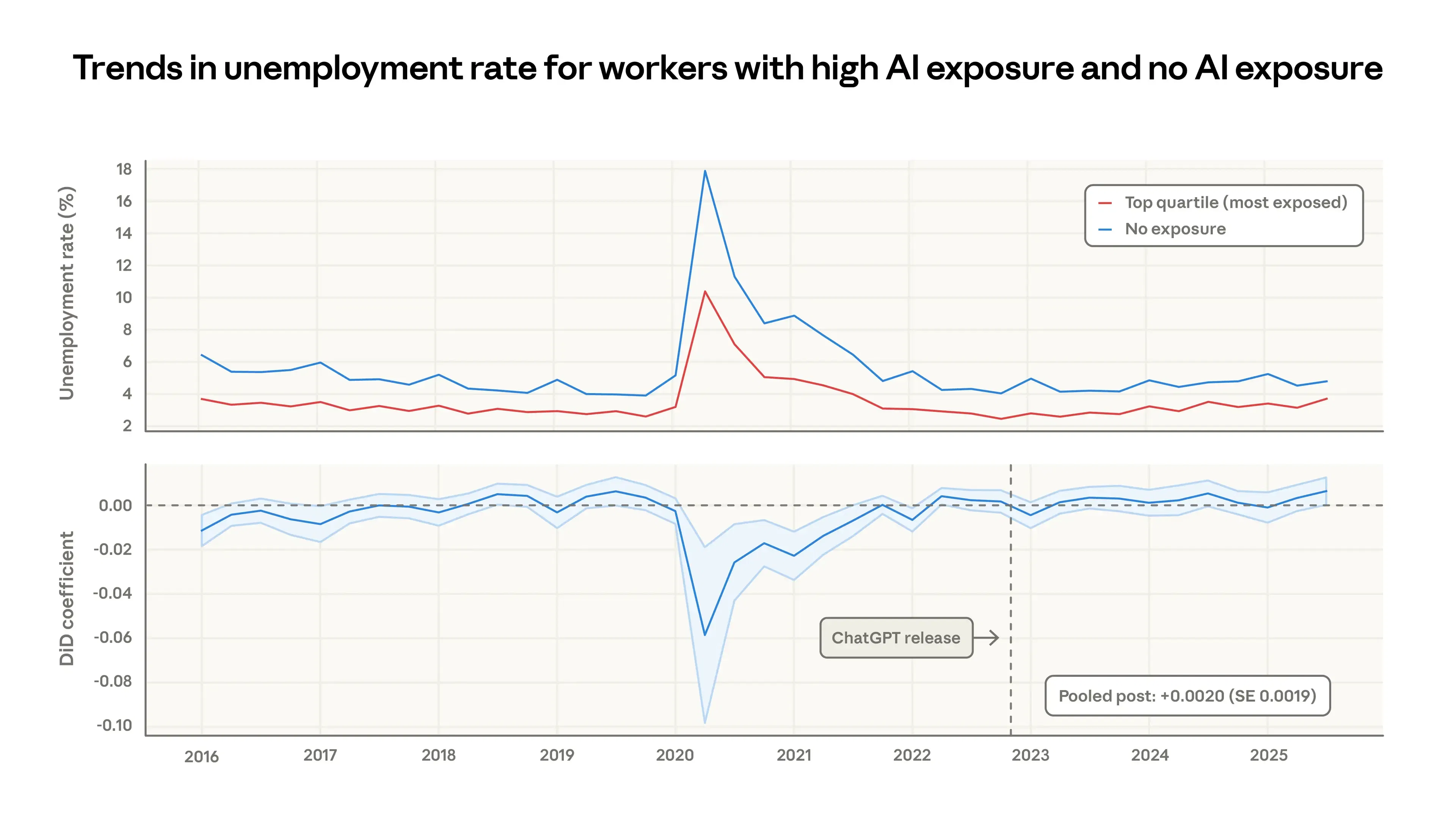 Using employment data from the Current Population Survey, researchers compared unemployment trends between highly exposed workers and those in roles with no AI exposure. The results show that unemployment rates in the two groups have remained broadly similar since 2022.