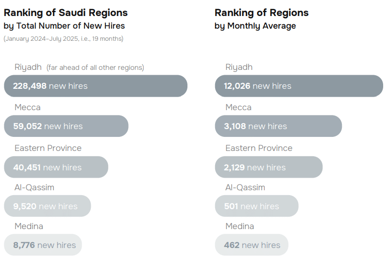 Region-wise, the data points to a gradual broadening of growth beyond the capital. Riyadh continues to dominate recruitment, accounting for more than half of all new hires nationwide.